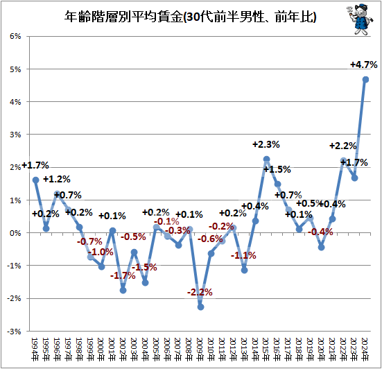 ↑ 年齢階層別平均賃金(20代前半男性、前年比)