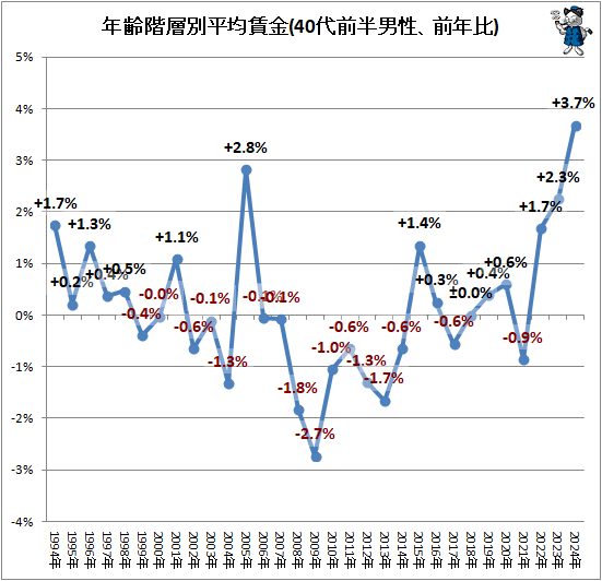 ↑ 年齢階層別平均賃金(30代-50代前半男性、前年比)