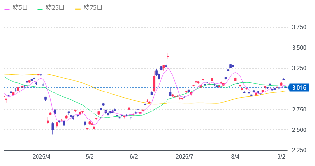 10年範囲のチャートで見ると、2016年から2020年頭ぐらいまでは、2000-3000の間のレンジでの値動きを示しているのが分かる。そして新型コロナウイルス流行による需要減退懸念による下落が大きなもの、そしてその復調やロシアによるウクライナ侵略戦争による上昇が確かなものであることも確認できる。2022年ぐらいからは3000円台半ばを天井として、何度かその天井を超える値上がりをトライしたが弾かれるような動きを繰り返している。