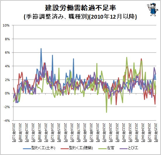 ↑ 建設労働需給過不足率(季節調整済み、職種別)(2010年12月以降)