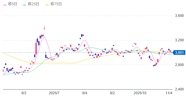 10年範囲のチャートで見ると、2016年から2020年頭ぐらいまでは、2000-3000の間のレンジでの値動きを示しているのが分かる。そして新型コロナウイルス流行による需要減退懸念による下落が大きなもの、そしてその復調やロシアによるウクライナ侵略戦争による上昇が確かなものであることも確認できる。2022年ぐらいからは3000円台半ばを天井として、何度かその天井を超える値上がりをトライしたが弾かれるような動きを繰り返している。