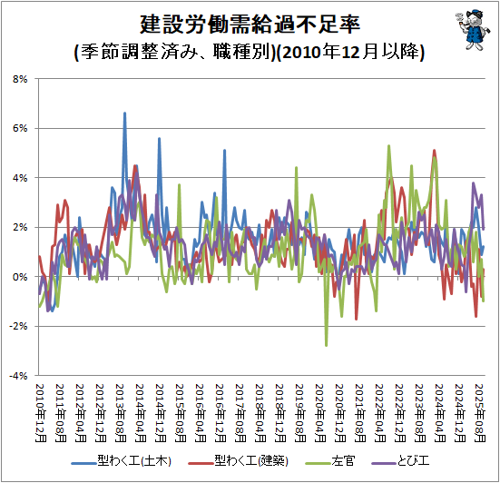 ↑ 建設労働需給過不足率(季節調整済み、職種別)(2025年10月)